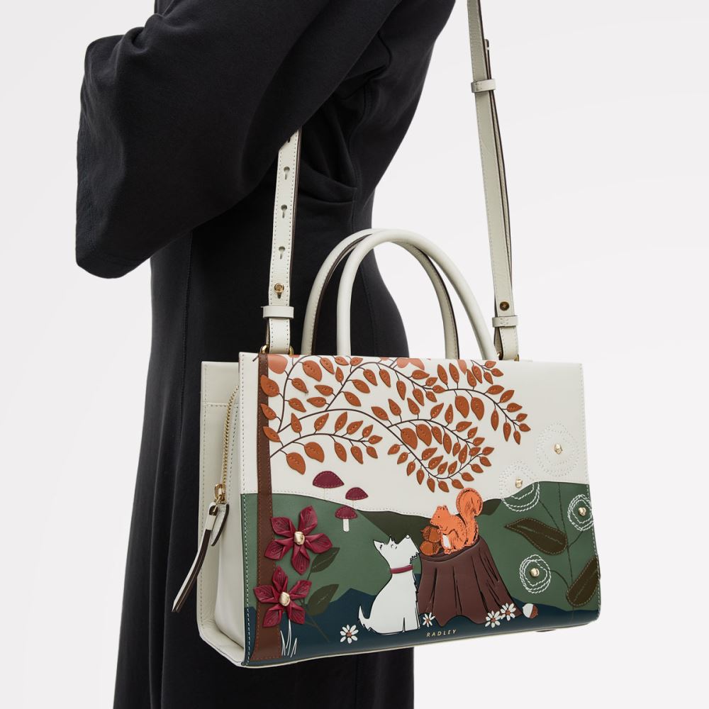 Exquisite craft detailing showcased in soft leather. Autumn Leaves is this season's collectible picture bag. A snapshot of autumn created using 3D leather applique', screen prints, foil embossing and intricate stitching and considered techniques that decorate our original triple - compartment shape.
