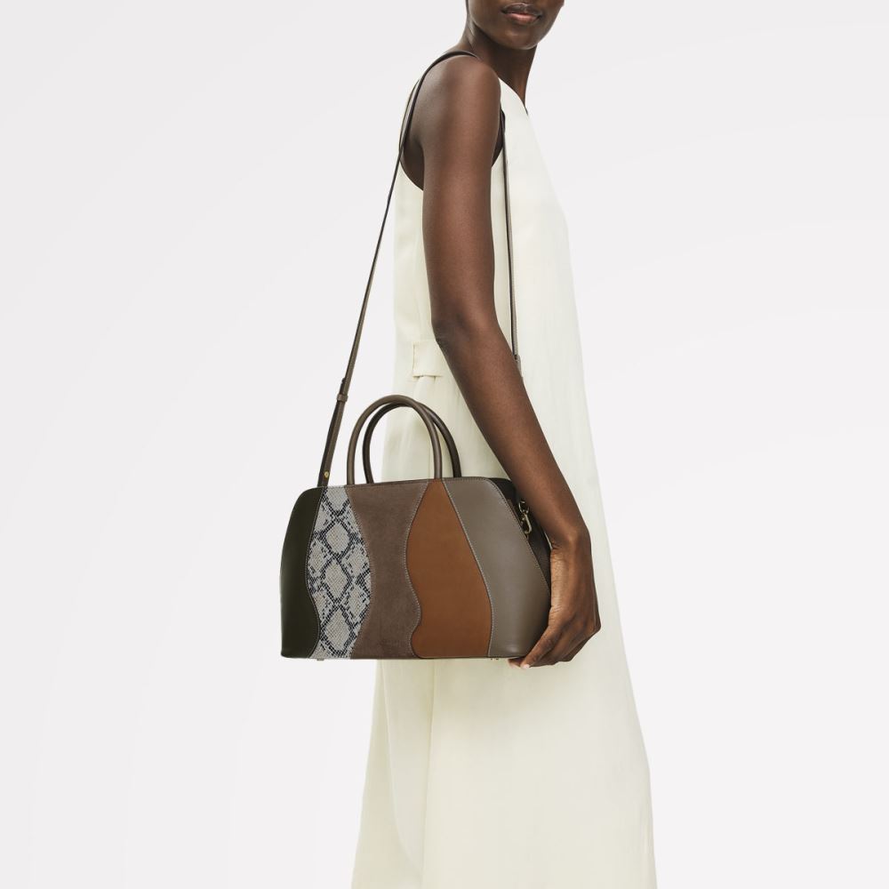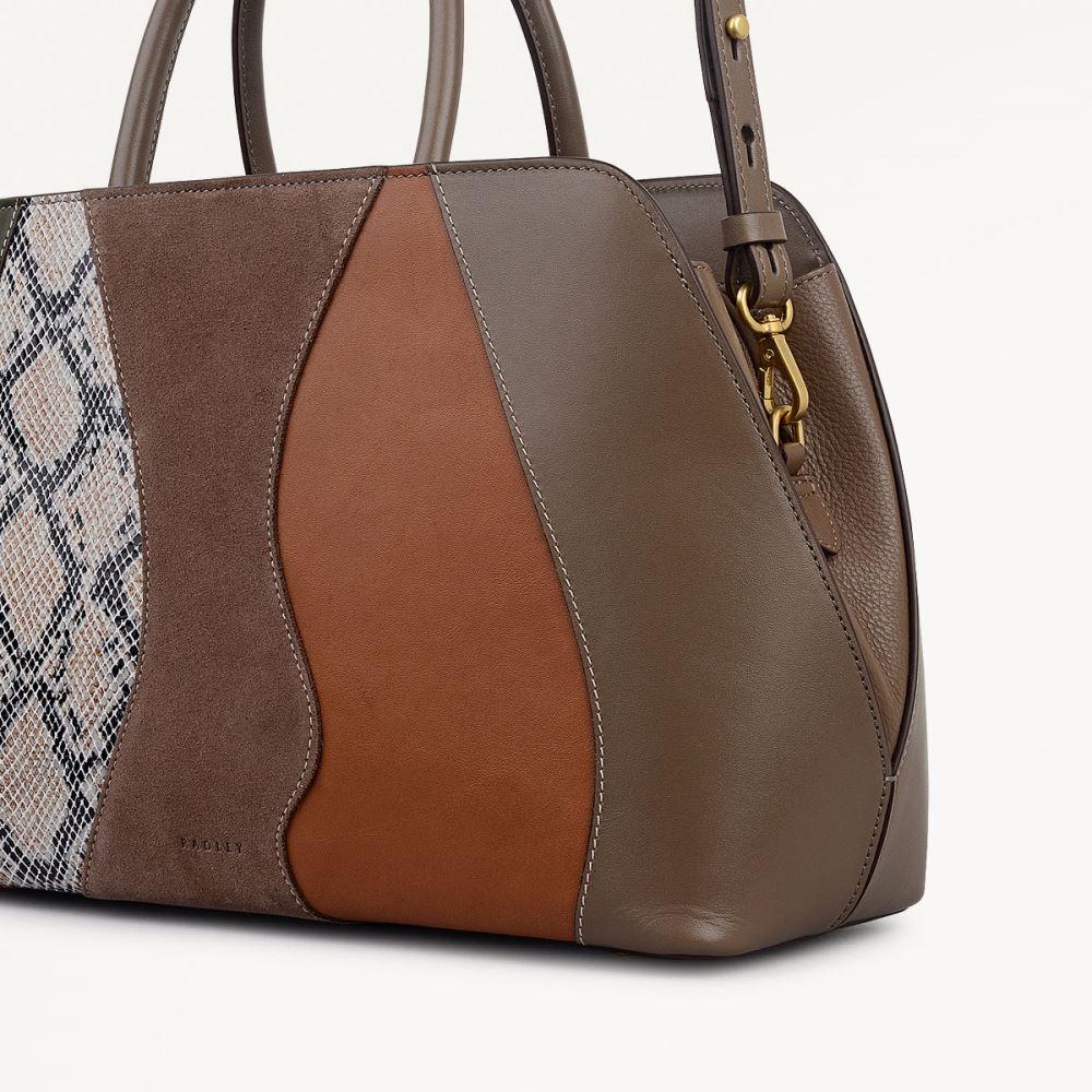 The sleek silhouette of our Liverpool Street grab bag, created with a curving textured patchwork of Italian suede, snake-embossed, grain and smooth leathers. With the same features as the original, including three interior compartments and a detachable strap.