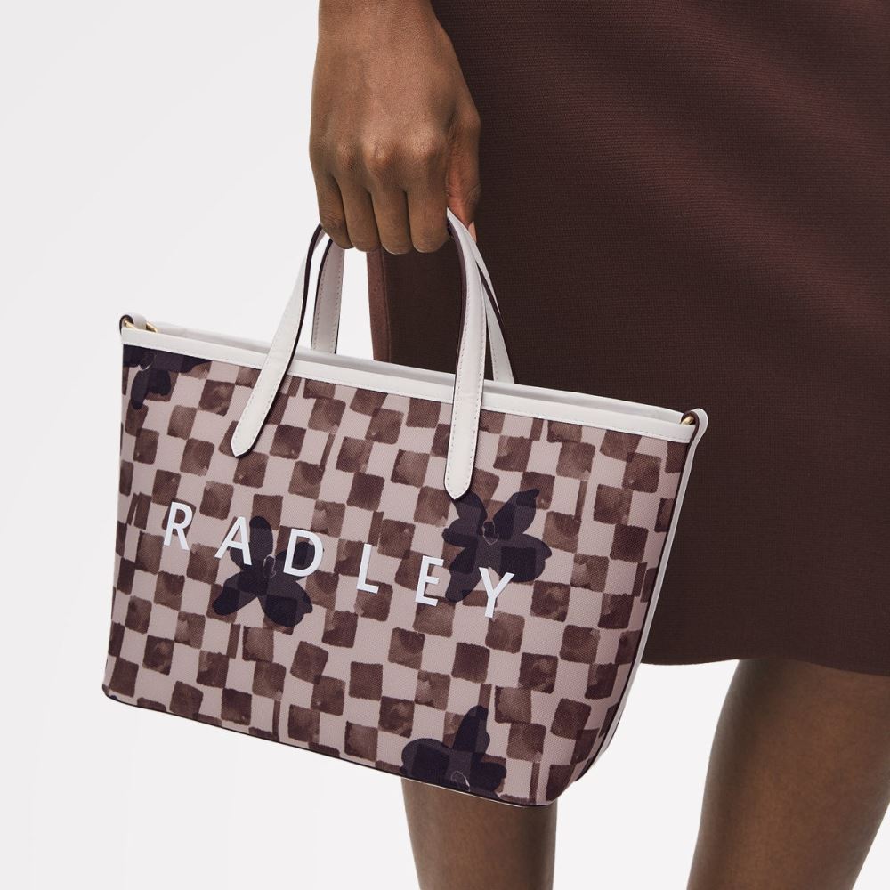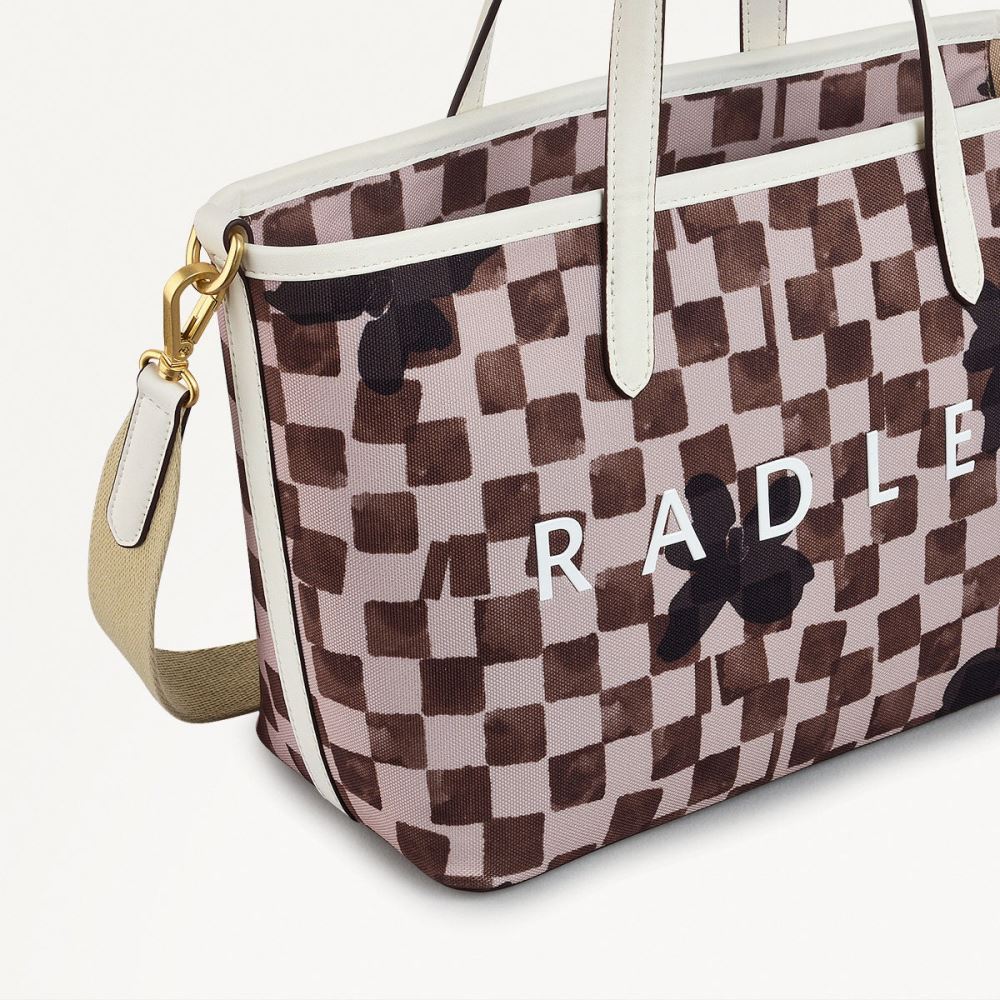 Artisanal chequerboard and floral prints decorate the fabric of our Southwell Gardens grab bag. Crafted using recycled polyester, made from plastic bottles that would otherwise go into landfill, and enough space for your workday essentials.