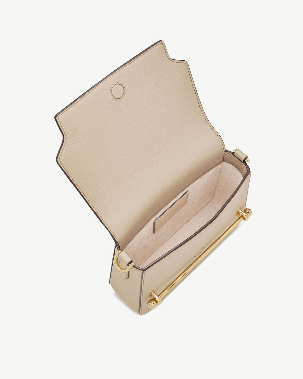 100% Handmade in Spain100% Bovine LeatherCrosshatch finishGold hardwareDetachable adjustable leather strapSoft microfibre lining