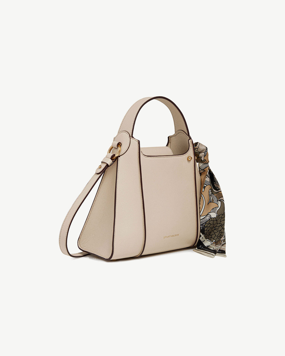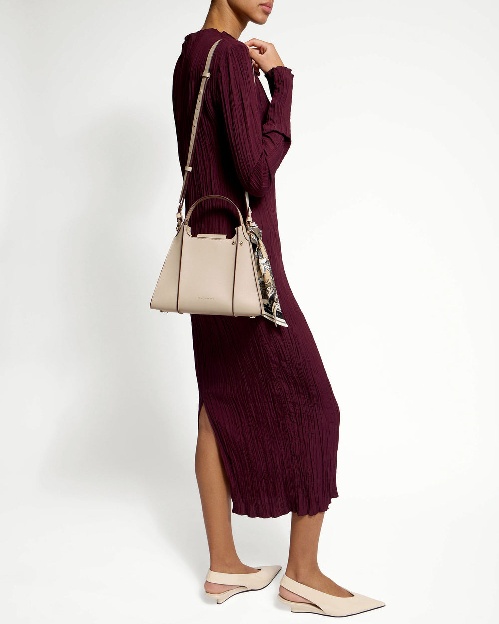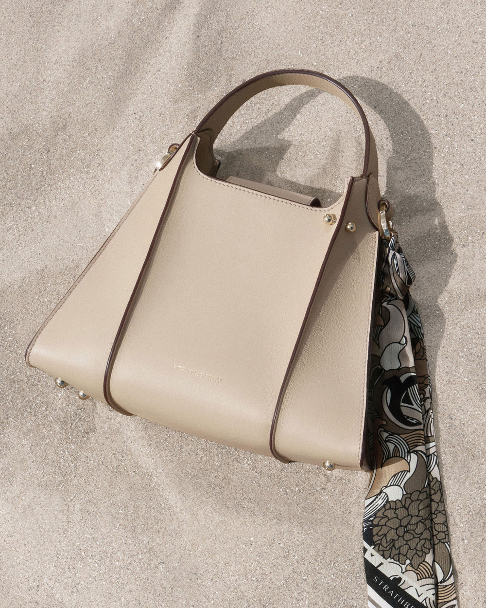 The Arkshell top handle bag is inspired by the graphic ridged lines characteristic of ark-shells found on the coast of Scotland. The bag interprets these graphic ridges into an architectural form thanks to the raw painted edges and structured paneling of this calf leather style. Each bag is adorned with a unique and detachable silk scarf that complements the bag's colorway. This fusion of inspiration from nature and artisanal craftsmanship creates a timeless, elegant, and versatile bag.