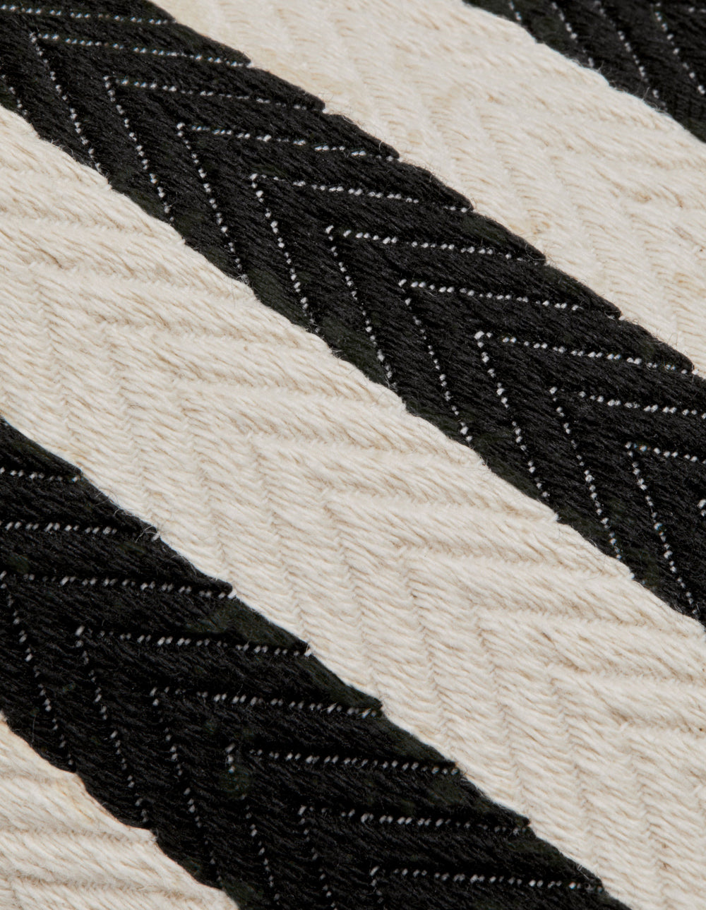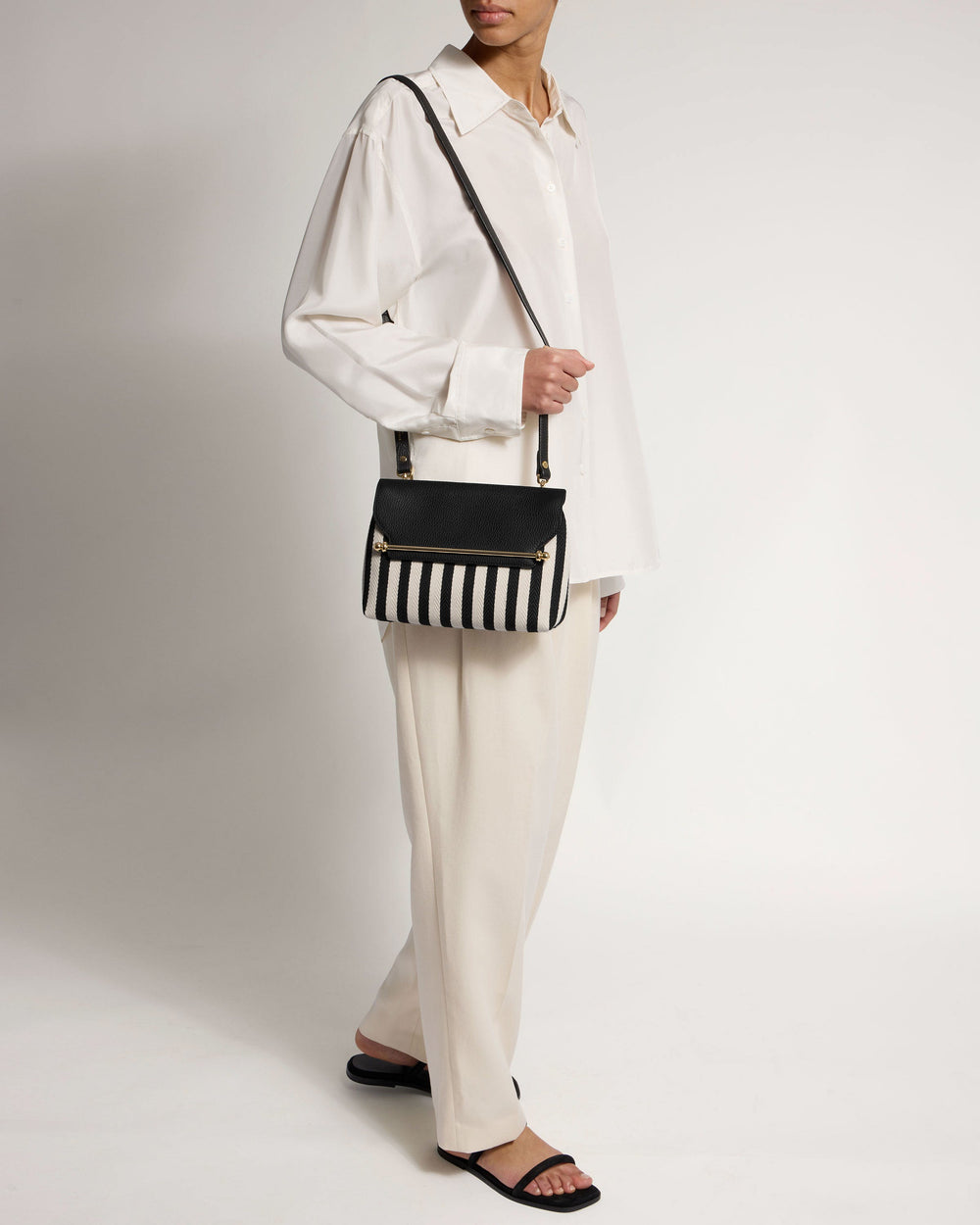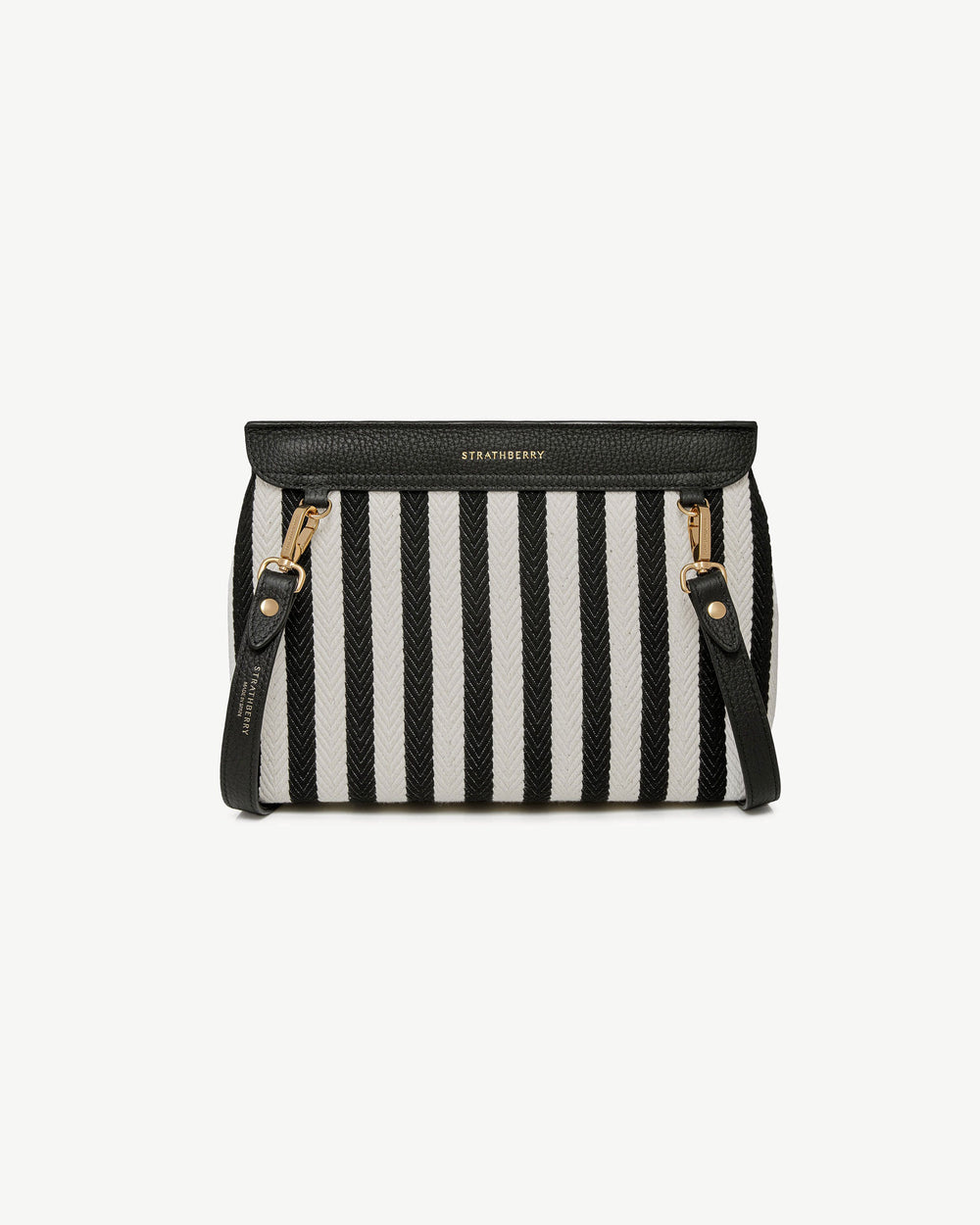 Handcrafted in SpainStriped canvasSoft microfibre liningGold hardwareSignature Music BarAdjustable leather strap includedInterior card slot