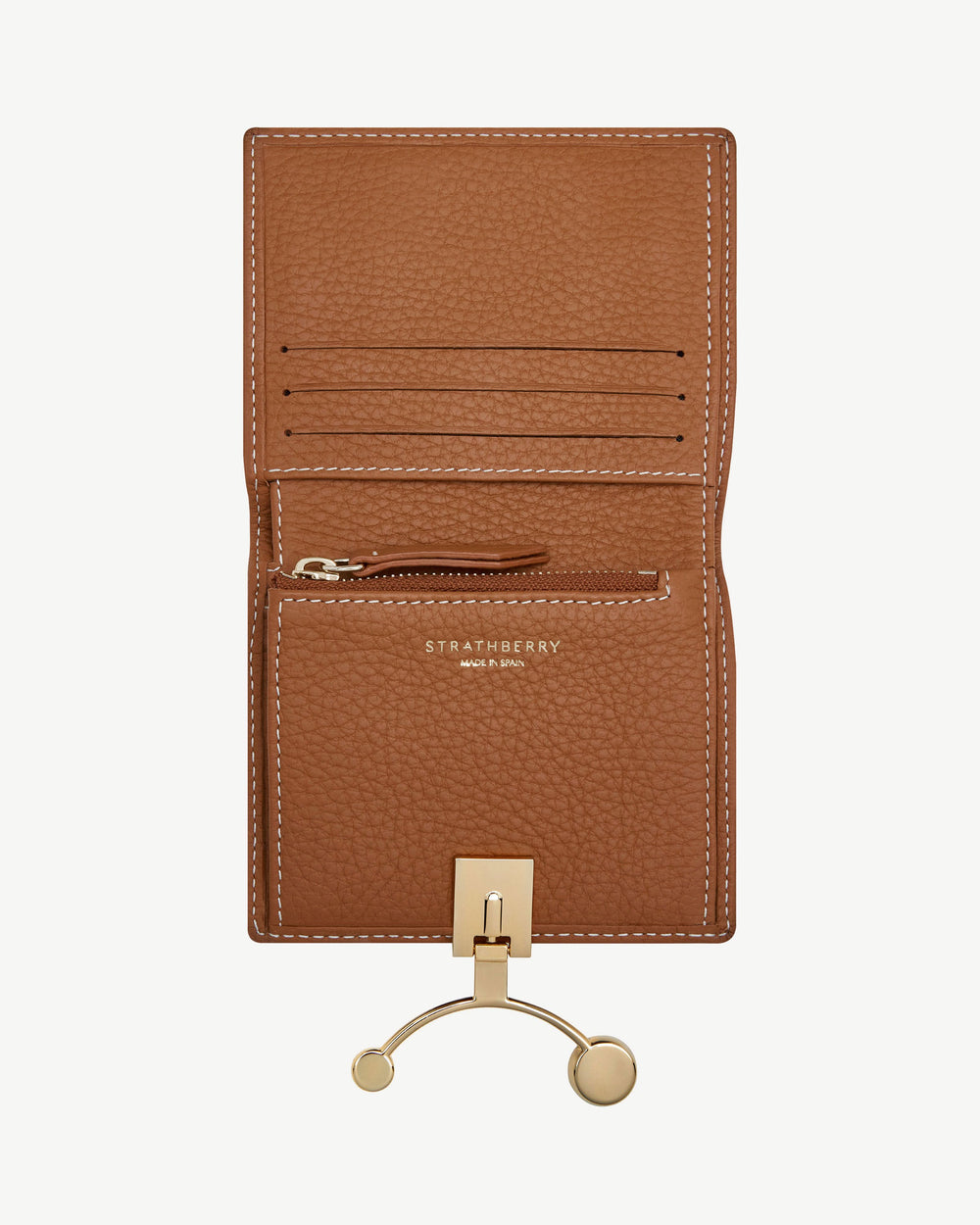 A sleek design perfect for carrying your cash and cards without taking up too much precious bag space. The Crescent Wallet is secured by a hinged closure that features the contemporary arched Strathberry bar that is characteristic of the Crescent bag family. The wallet unfolds to reveal a zip pocket, x 3 card slots and larger slit pockets for notes. Exquisitely crafted calf leather by hand in Spain.