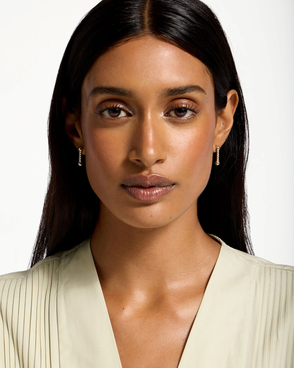 Inspired by the works of Scottish artist Eduardo Paolozzi, the Mosaic collection is a masterpiece of clean, precise lines. Handcrafted in Tuscany from 22 carat gilded gold, these contemporary Crystal Mosaic earrings are perfect for an elevated day look, or worn for formal occasions.