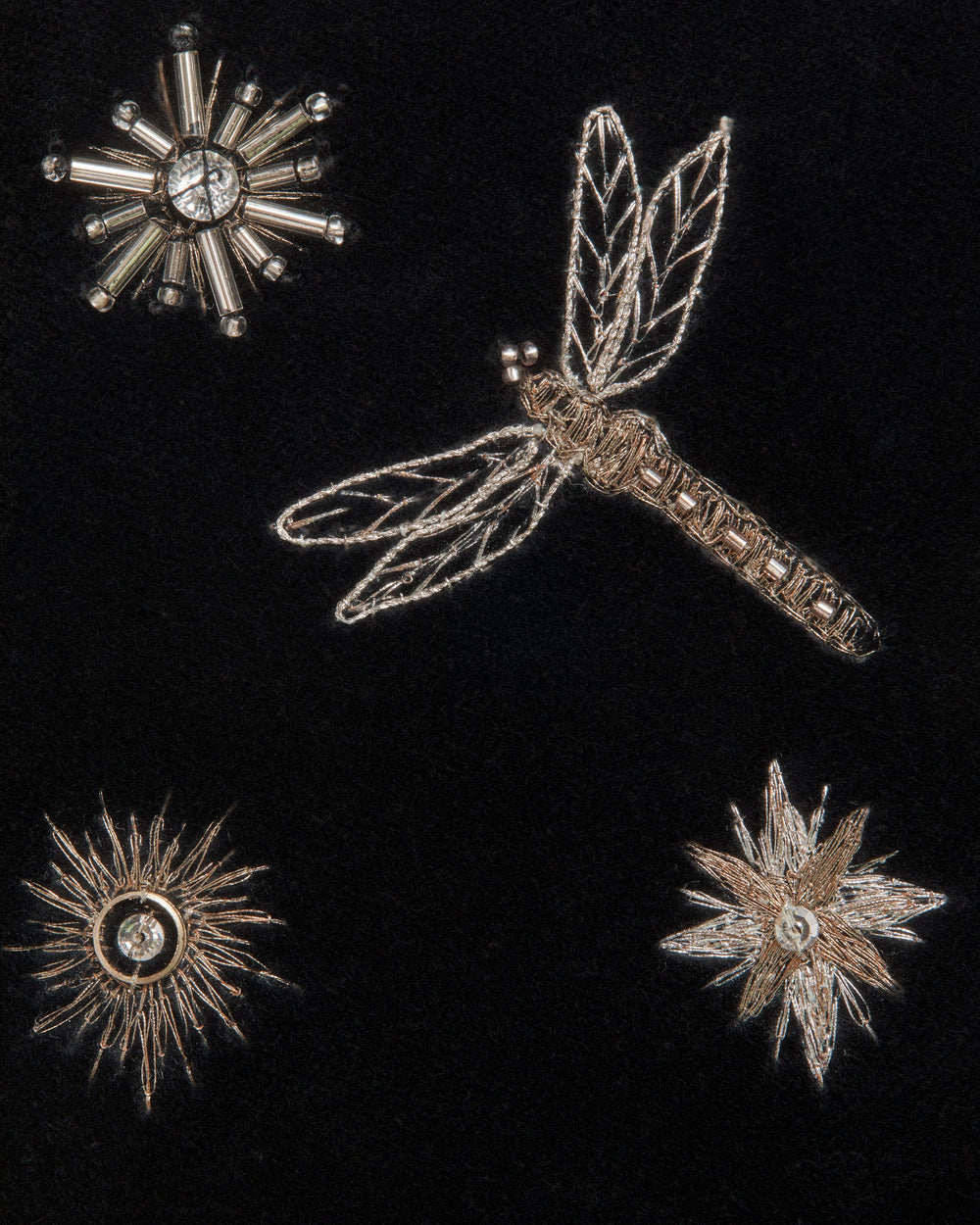 Drawn from the untamed beauty of the American Prairie, the hand-embroidered design resembles the grace of a dragonfly dancing around the fields. Our skilled artisans spend up to 5 hours hand-stitching the intricate metallic threads and glass stones adding a 3D depth to show the movement of the dragonflies.