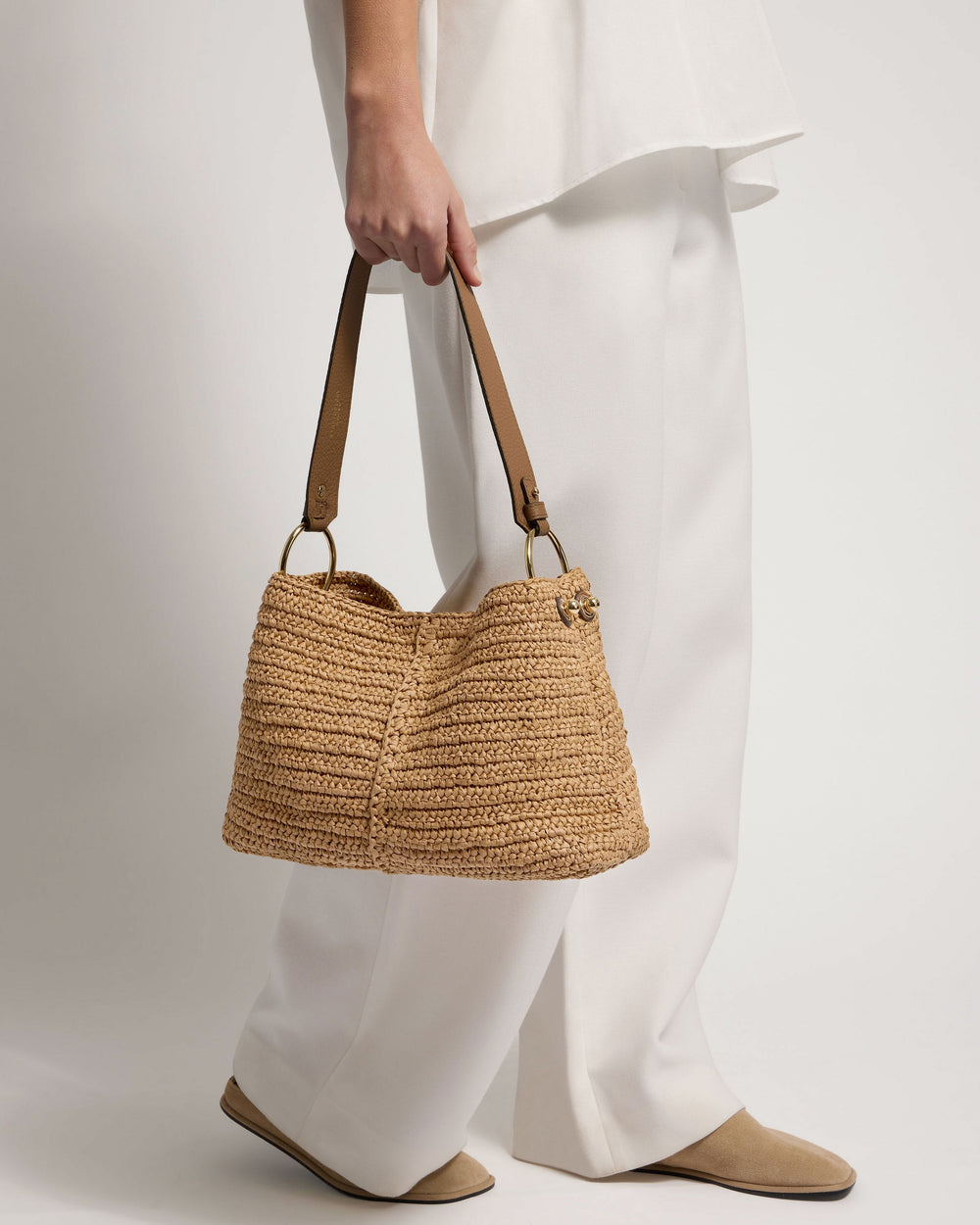 Handcrafted in Spain100% RaffiaGold hardwareLeather shoulder strapMagnetic closureInterior zipped pocketInterior leather base