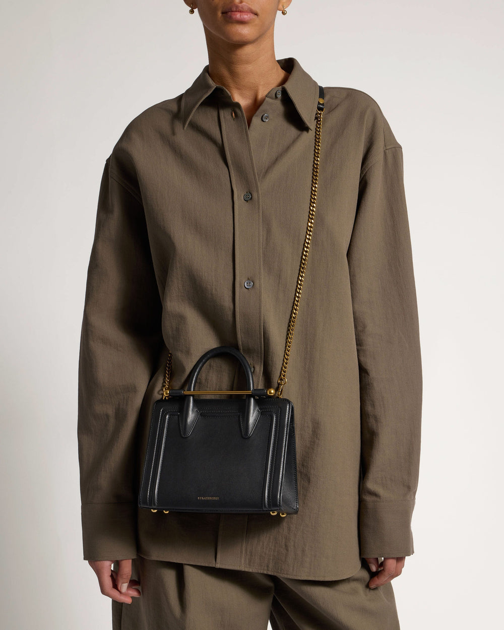 The perfect in-between. Inspired by a vintage music folio discovered by our founders, the Mini Tote introduces a highly requested new size, bridging the gap between the Nano and the Midi. Defined by its understated silhouette, this timeless design features the signature Music Bar closure that elegantly secures the top handle. Handcrafted with versatility in mind, it can be carried by hand or styled crossbody with the detachable chain strap—ideal for everyday elegance.