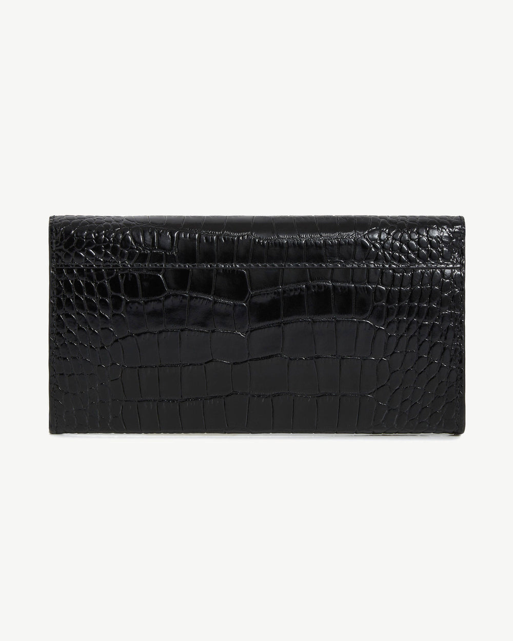 Handcrafted in Spain100% Croc-embossed calf leatherGold hardwareSignature barInterior zipped pocket8 card slotsDetachable chain