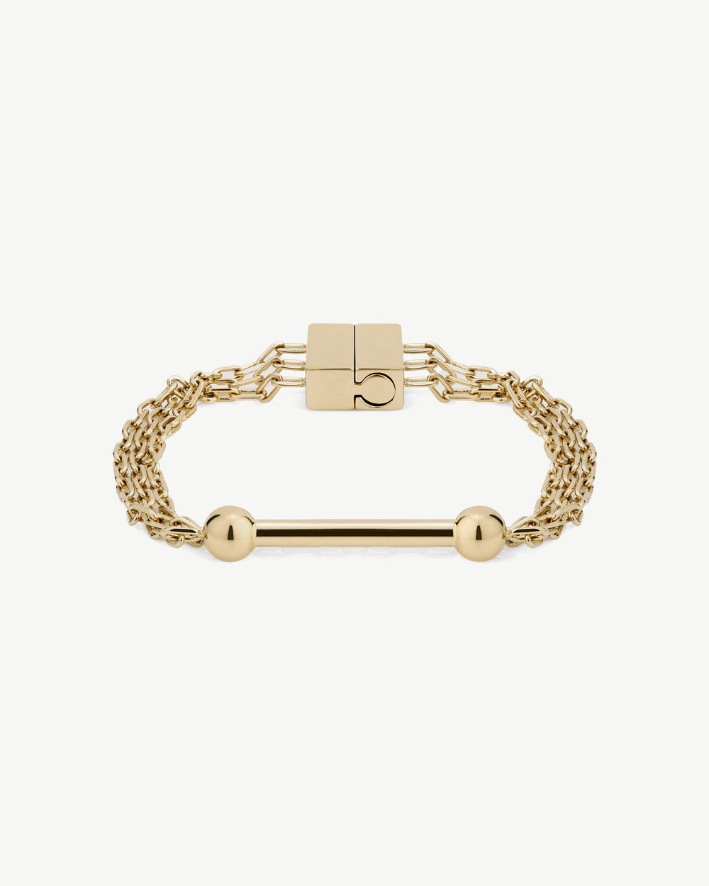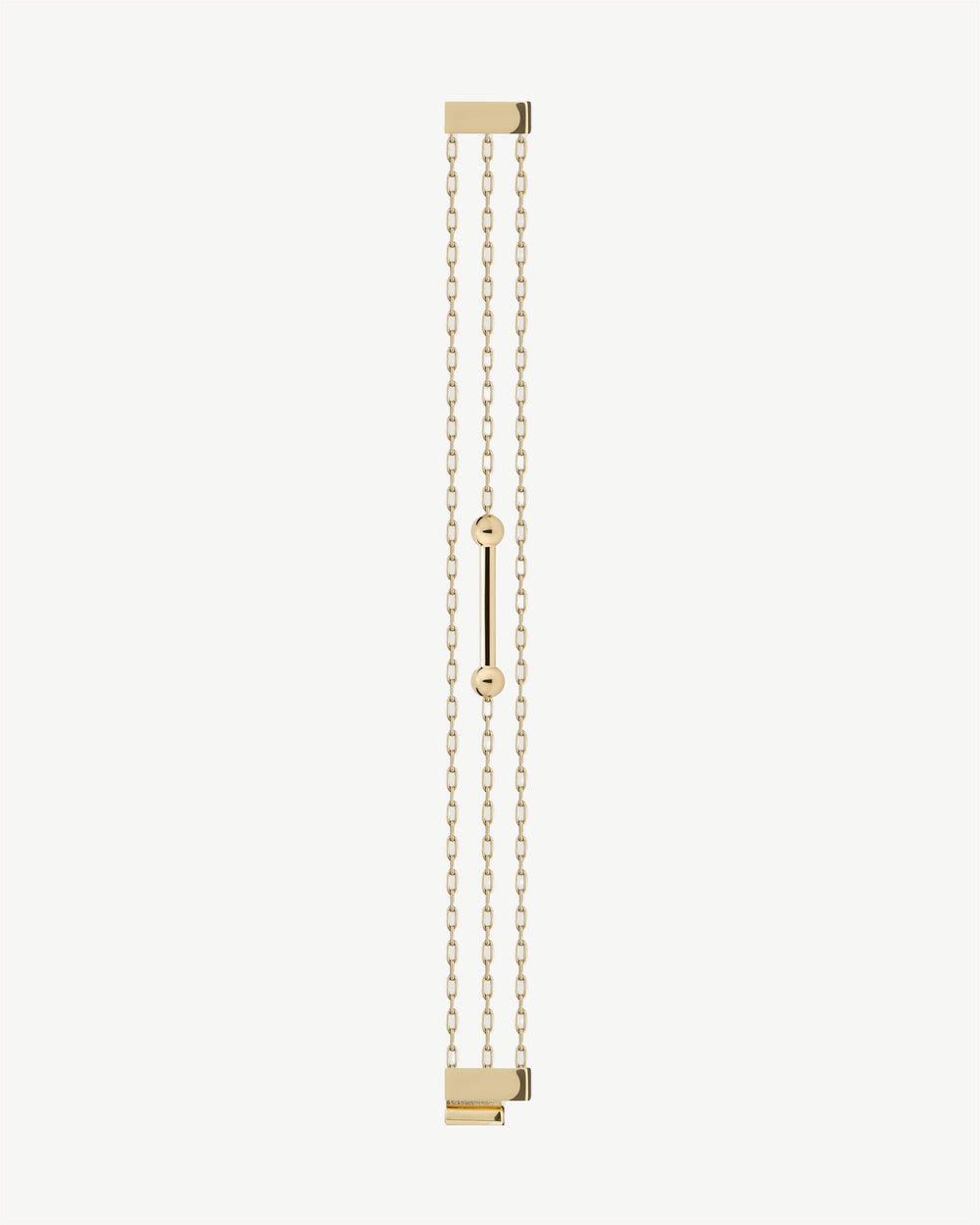 Adorn your wrist with our timeless Music Bar Chain Bracelet, in size small. Handcrafted in Italy, this bracelet features three rows of chains with our signature music bar in the centre chain, and with a magnetic clasp closure.Strathberry jewellery is finely crafted in Tuscany, Italy by artisans with over 60 years of experience passed down from generation to generation. All pieces are presented in a velvet-lined luxury gift box, the perfect finishing touch for that special someone or as a treat for yourself.