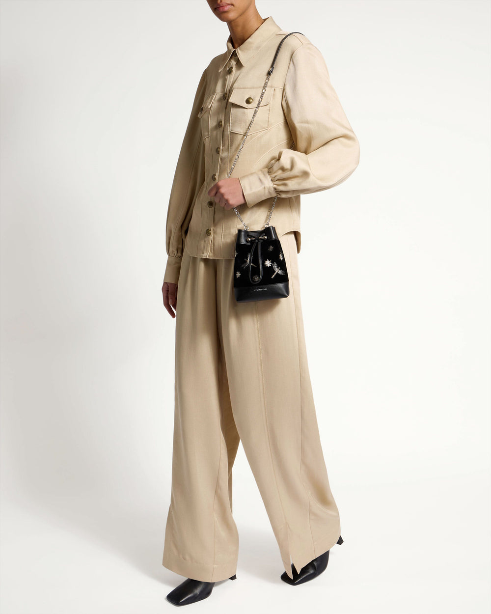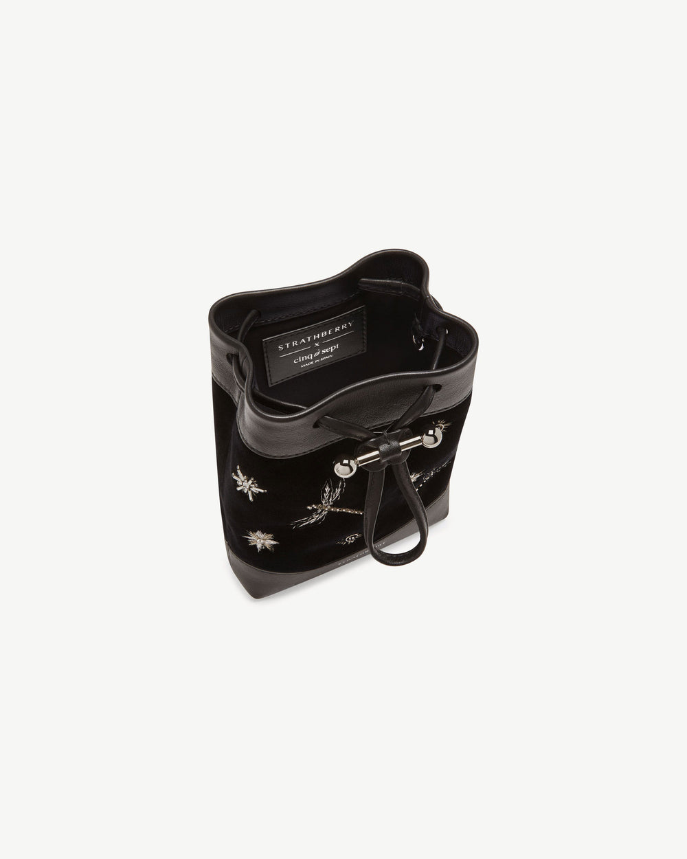 Handcrafted in Spain100% Calf LeatherVelvet fabricHand-embroiderySoft microfibre liningSilver hardwareSignature Music BarDrawstring closureComes with one removable leather and chain strap