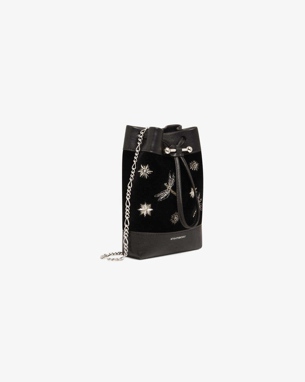Compact style, crafted for ease. The Osette Midi Pouch's soft structure is re-imagined in a velvet fabrication. Drawn from the untamed beauty of the American Prairie, the hand-embroidered design resembles the grace of a dragonfly dancing around the fields. Our skilled artisans spend up to 5 hours hand-stitching the intricate metallic threads and glass stones adding a 3D depth to show the movement of the dragonflies.