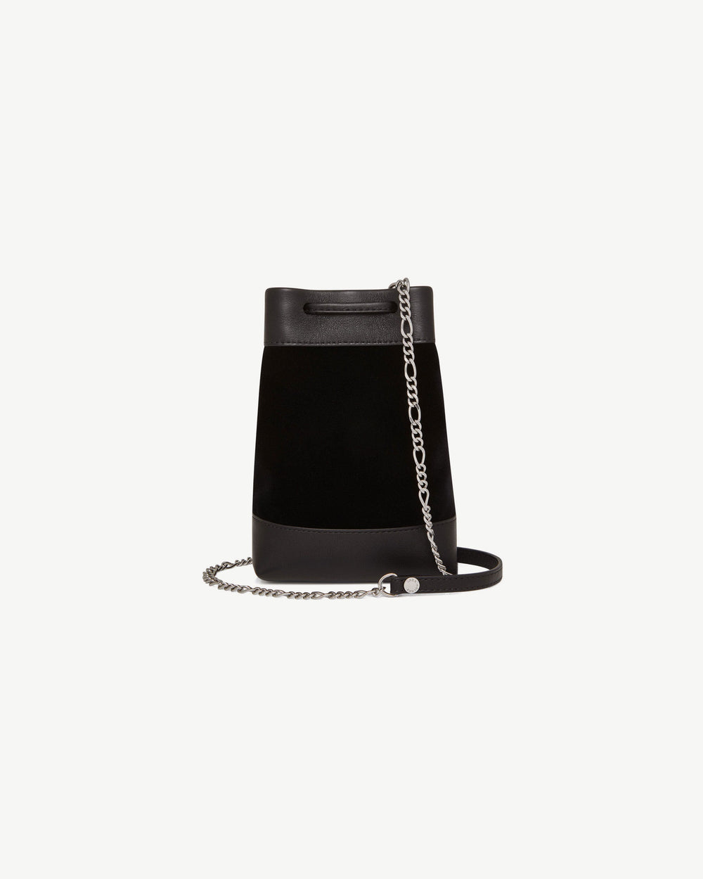 Handcrafted in Spain100% Calf LeatherVelvet fabricHand-embroiderySoft microfibre liningSilver hardwareSignature Music BarDrawstring closureComes with one removable leather and chain strap