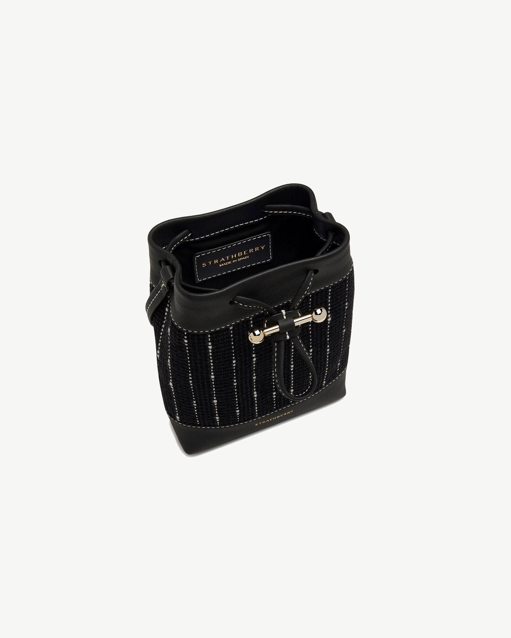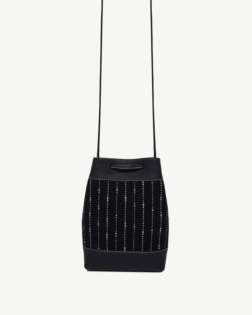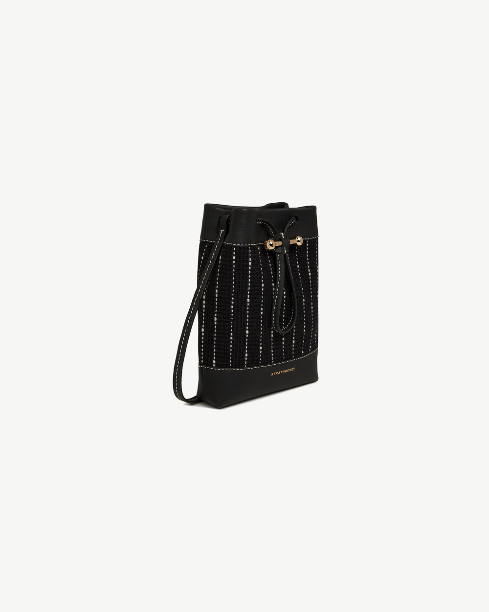 Handcrafted in SpainPinstripe Linton tweedCalf leatherGold hardwareSignature Music BarDrawstring closureLong Leather Strap