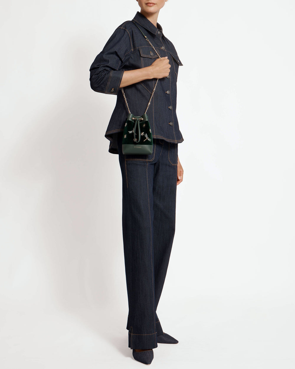 Compact style, crafted for ease. The Osette Midi Pouch's soft structure is re-imagined in a velvet fabrication. Drawn from the untamed beauty of the American Prairie, the hand-embroidered design resembles the grace of a dragonfly dancing around the fields. Our skilled artisans spend up to 5 hours hand-stitching the intricate metallic threads and glass stones adding a 3D depth to show the movement of the dragonflies.