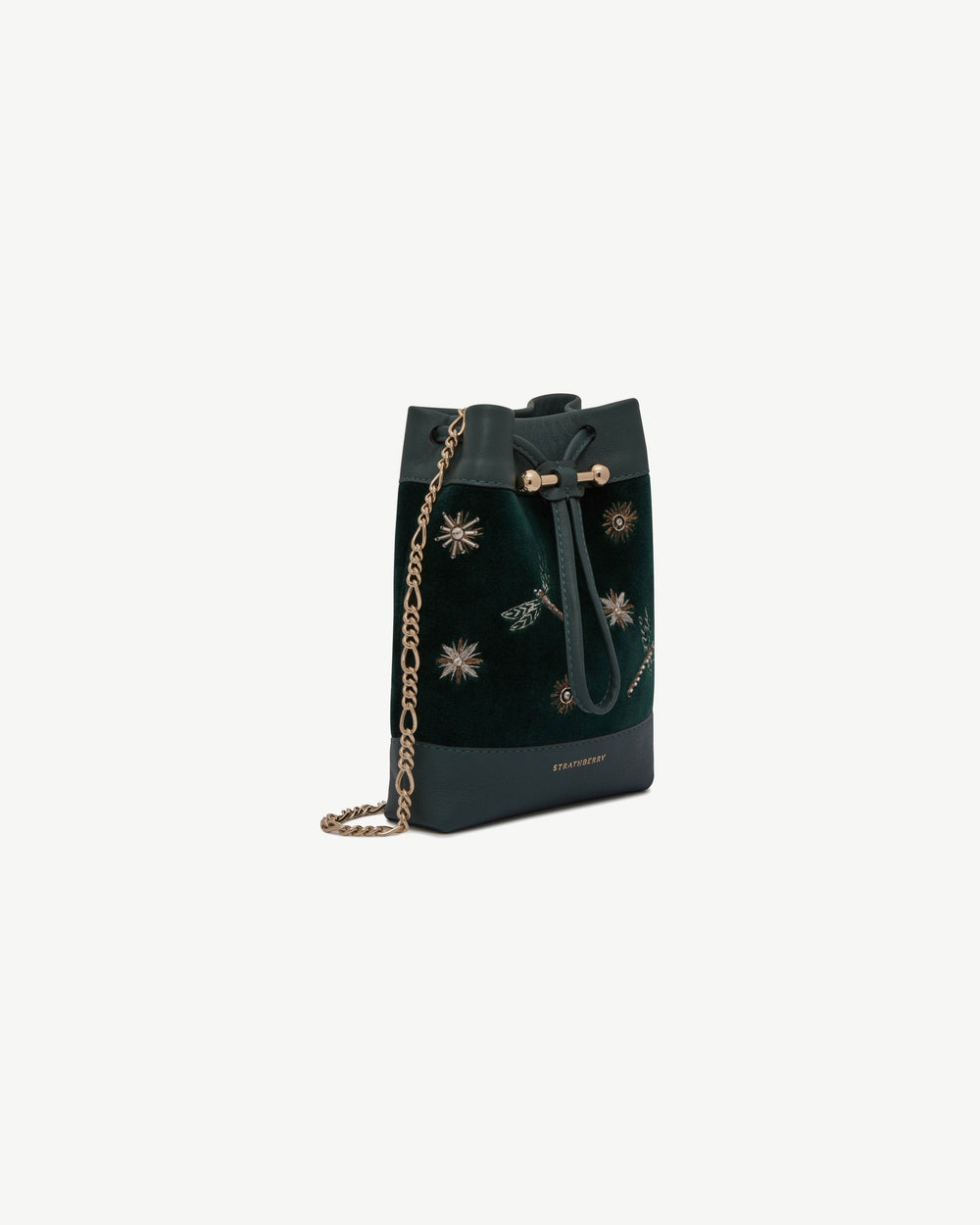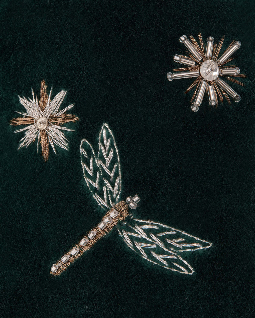 Compact style, crafted for ease. The Osette Midi Pouch's soft structure is re-imagined in a velvet fabrication. Drawn from the untamed beauty of the American Prairie, the hand-embroidered design resembles the grace of a dragonfly dancing around the fields. Our skilled artisans spend up to 5 hours hand-stitching the intricate metallic threads and glass stones adding a 3D depth to show the movement of the dragonflies.
