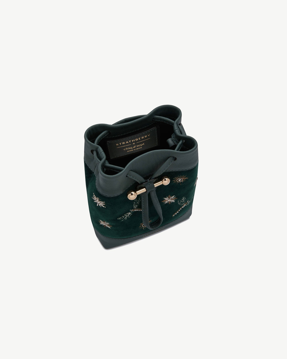 Handcrafted in SpainCalf leatherVelvet fabricHand-embroiderySoft microfibre liningSilver hardwareSignature Music BarDrawstring closureComes with one removable leather and chain strap
