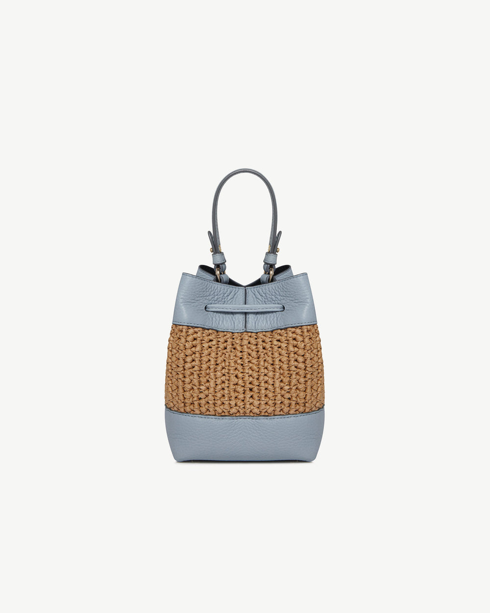 Handcrafted in Spain100% Raffia handwoven in IndiaGrain calf leatherGold hardwareDrawstring closureSignature Music BarLeather top-handleDetachable adjustable leather strapGold feet
