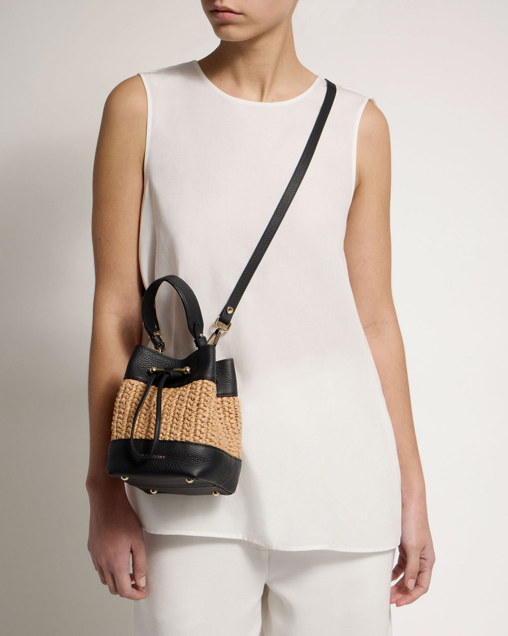 Handcrafted in Spain100% Raffia100% Grain calf leatherSoft microfibre liningGold hardwareDrawstring closureSignature barLeather top-handleDetachable adjustable leather strapGold feet