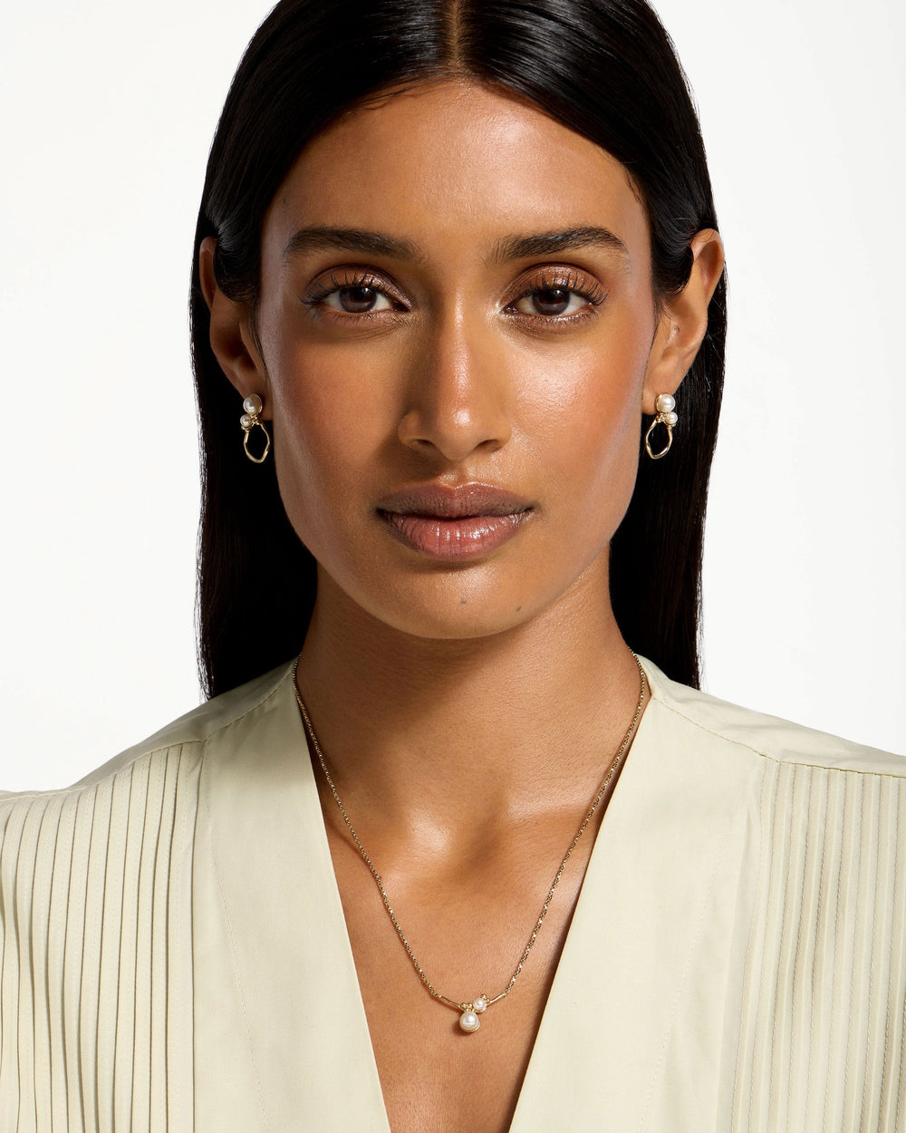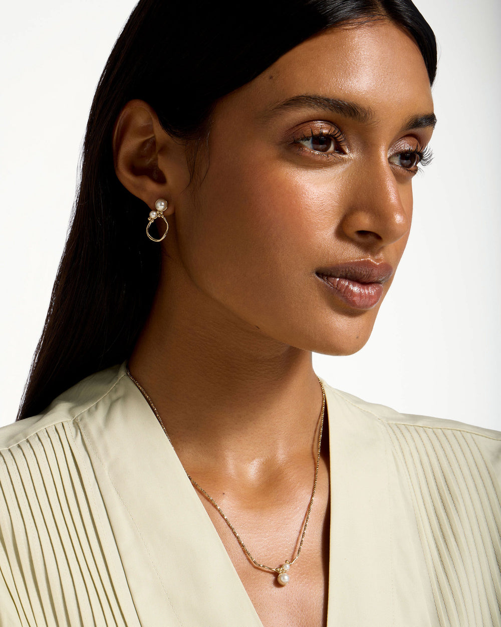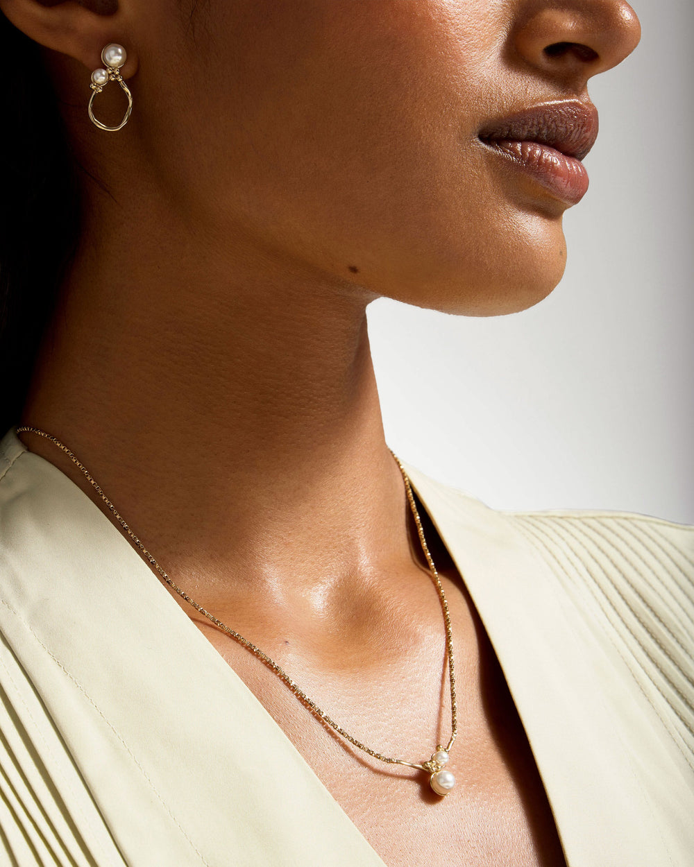 A timeless adornment that exudes elegance, our Pearl Cluster Necklace is impeccably crafted by artisans in Tuscany, Italy. The 22 carat gilded gold chain meets with a pearl and sphere cluster, adding light, delicate detail to your outfit. Wear alone for a subtle statement, or with our Pearl Cluster earrings for a cohesive pairing.
