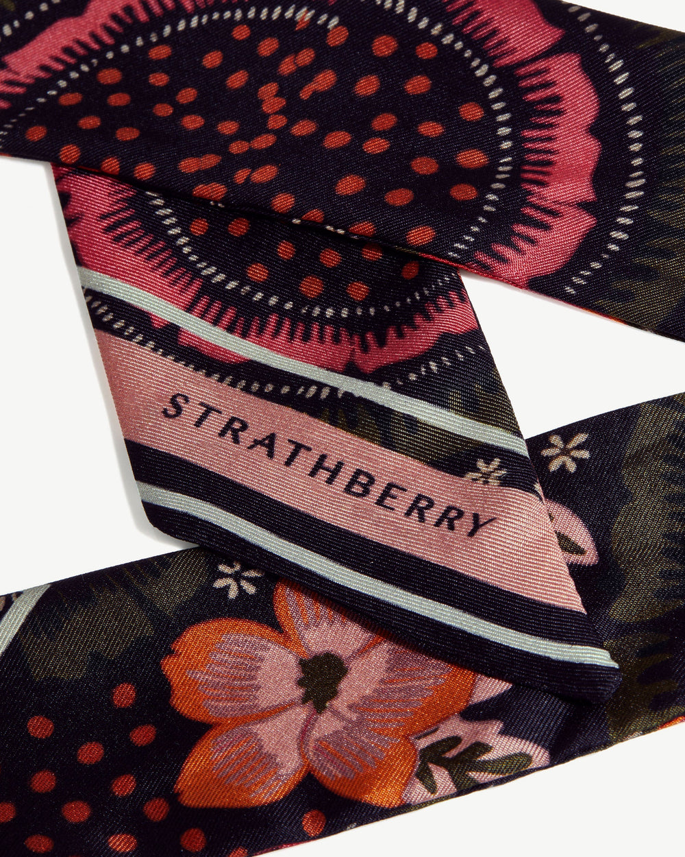 Crafted from exquisite silk, the Strathberry Silk Skinny Scarf is perfect for adding a touch of personality to any look. This versatile piece can be worn around the neck or in the hair. Alternatively, it can be looped around the handle of a handbag for a contemporary finish. Made in the UK from 100% silk.