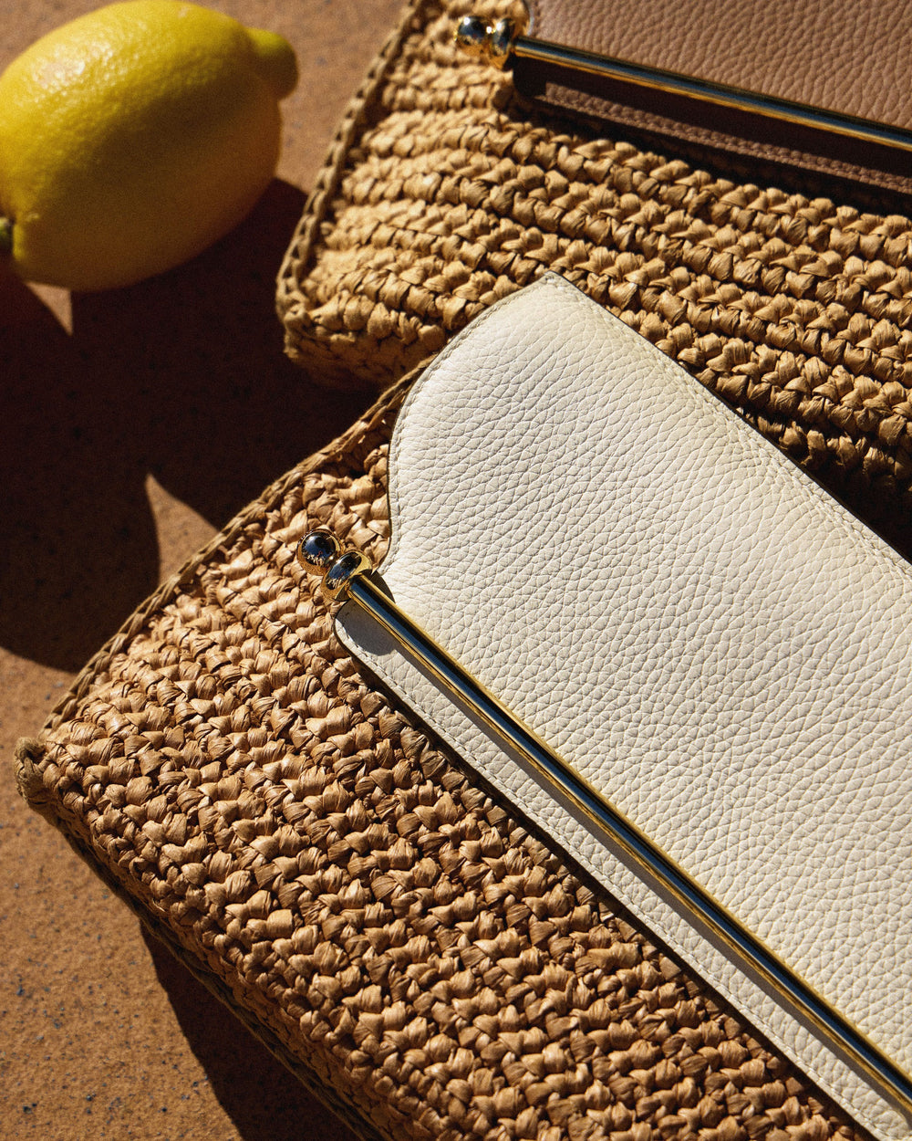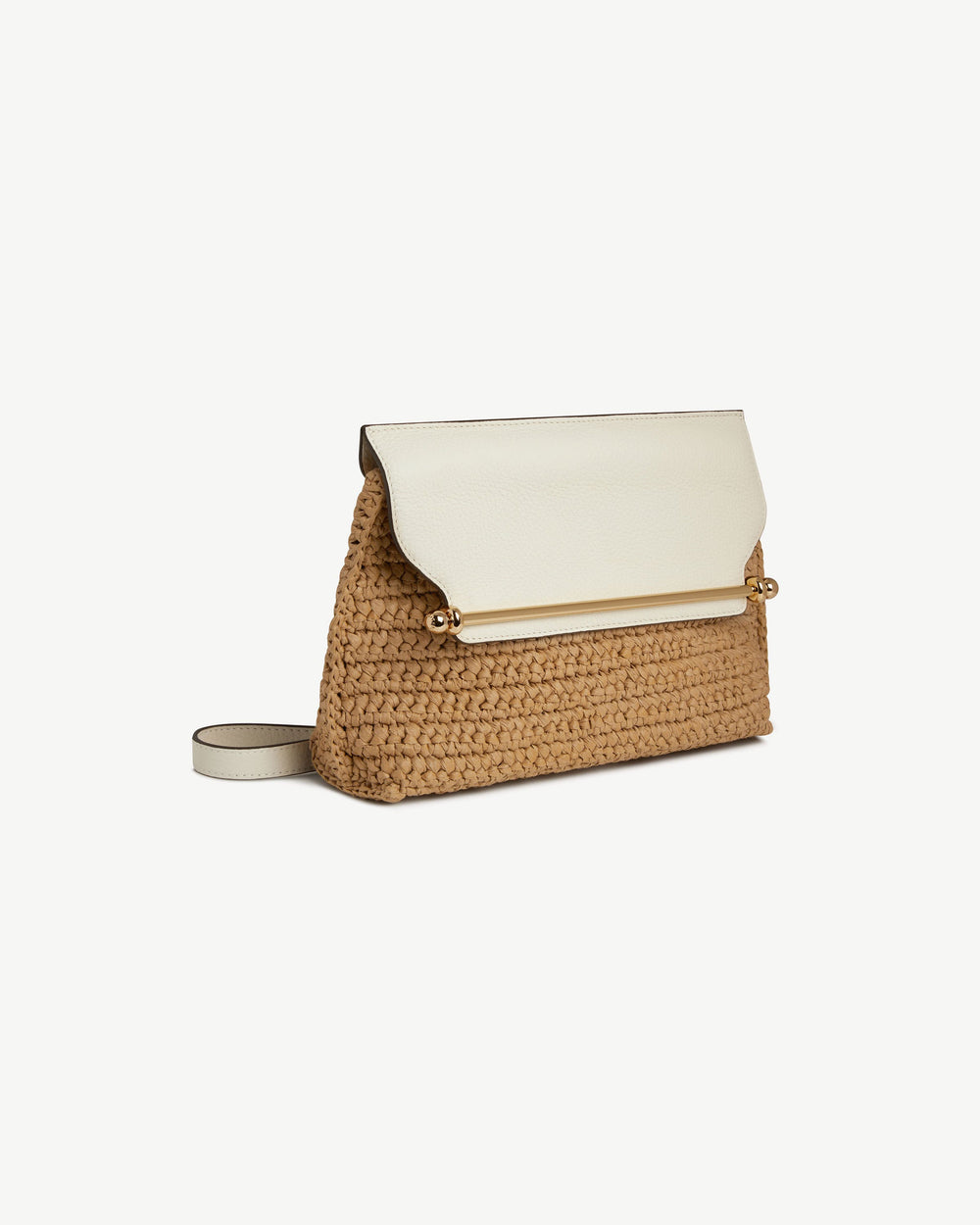 Handcrafted in Spain100% Raffia100% Grain calf leatherGold hardwareSignature Music BarMagnetic closureInterior leather baseDetachable adjustable leather strap